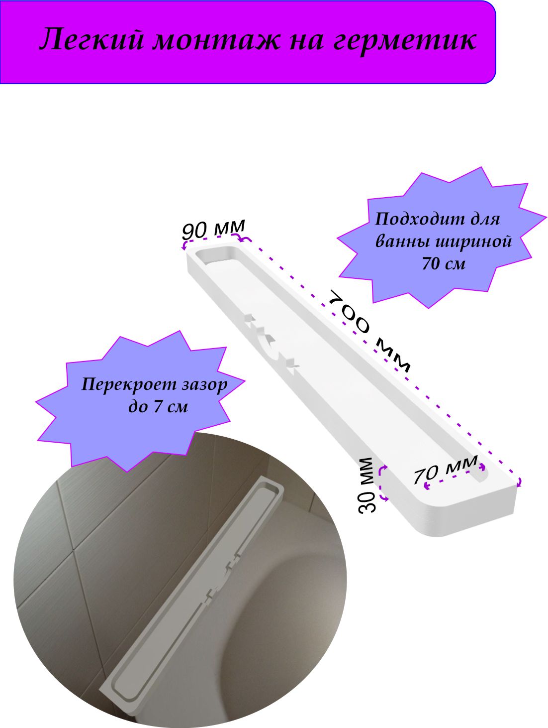 Закройте щели между ванной и стеной быстро и легко благодаря нашему бордюру-органайзеру! Быстрое крепление с использованием обычного санитарного герметика — и проблема решена всего за несколько минут. Создайте аккуратный и стильный дизайн ванной комнаты без лишних усилий и затрат. Бордюр прослужит долго, сохраняя привлекательный внешний вид и защищая от влажности и загрязнений.